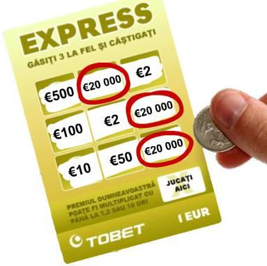 Express este un joc cu un card razuibil, joc la care participantii descopera noua campuri, castigand un premiu cash daca au trei campuri identice pe card. Toate premiile sunt instant cu un volum maxim al premiilor ajungand la 40.000 euro pentru Tobet.com.