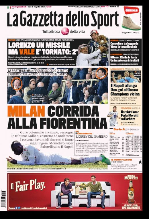 Gazzetta dello Sport se deschide astazi cu imaginea revoltatoare din tribunele stadionului Artemio Franchi - Adriano Galliani, presedintele clubului AC Milan a fost la un pas sa fie batut de un suporter al Fiorentinei.