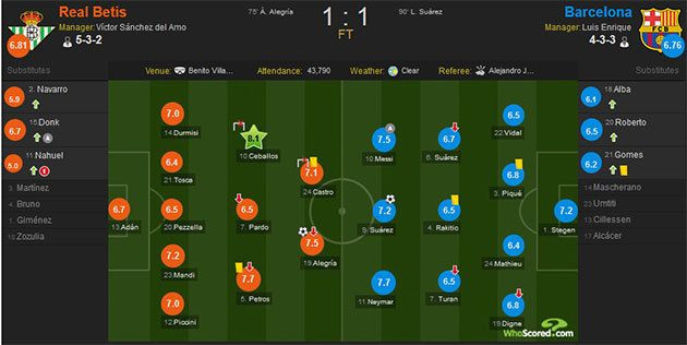 Cei de la Betis au aratat ca o echipa solida, reusind sa ii blocheze pe Messi, Neymar si Luis Suarez timp de 90 de minute, pana cand ultimul dintre ei a reusit sa egaleze.