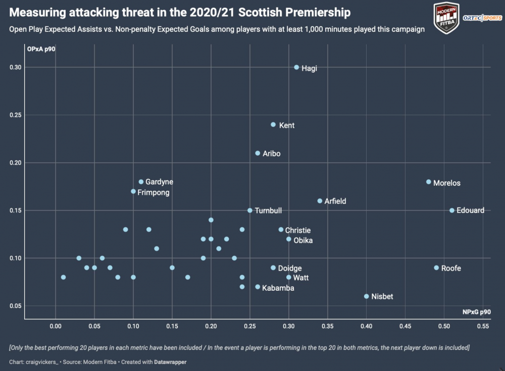 In cadrul analizei, au fost luati in calcul cei mai buni 20 de jucatori din prima liga a Scotiei, care au acumulat cel putin 1000 de minute de joc in acest sezon.