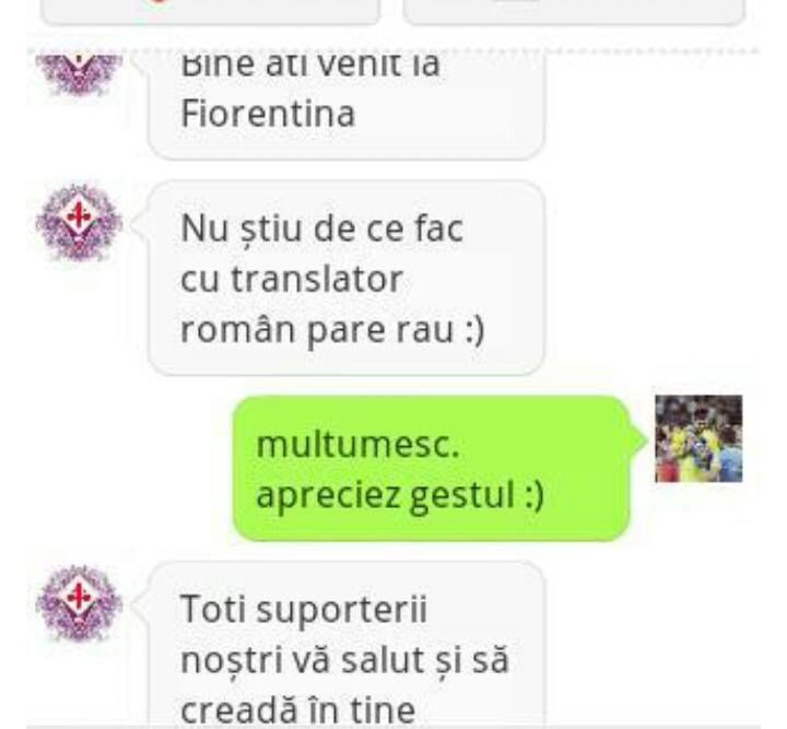 Fostul portar al campioanei e convins ca il poate scoate pe brazilianul Neto din primul 11. Tatarusanu primeste deja mesaje din partea suporterilor Fiorentinei, care s-au chinuit cu 'Google Translate' pentru a-i scrie in romana! Una dintre conversatiile pe care le-a avut cu un fan a ajuns pe un forum dedicat ultrasilor viola.