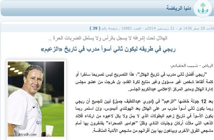 Al Hilal e doar pe locul 4 in prima liga din Arabia Saudita iar ultimul rezultat, 1-1 impotriva unei nou-promovate, Hajer, a starnit mania jurnalistilor arabi. Daca in primele meciuri de dupa plecarea de la Steaua era ridicat in slavi, acum Reghecampf a atacat dur, la limita calomniei!