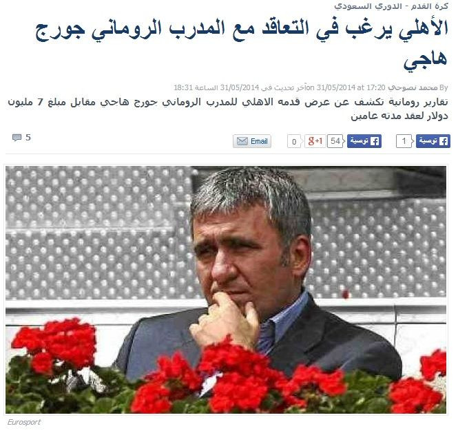 Oficialii lui Al Ahli, echipa la care evolueaza Eric, vor veni in Romania pentru a negocia cu Gica Hagi preluarea echipei din aceasta vara. Al Ahli e echipa armatei din Arabia Saudita si a marit oferta pentru Hagi, de la 2,5 milioane de dolari la 3,5 milioane pe an.