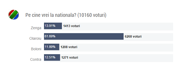 Intr-un sondaj realizat de www.sport.ro, Cosmin Olaroiu conduce de departe in topul preferintelor fanilor pentru postul de selectioner. Olaroiu e urmat de Zenga si Contra in clasament.