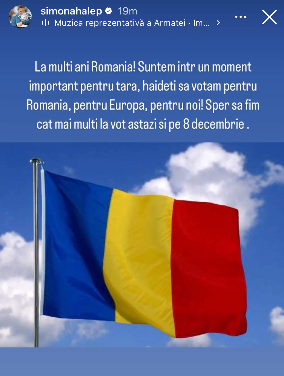 ”La mulți ani, România! Suntem într-un moment important pentru țară, haideți să votăm pentru România, pentru Europa, pentru noi! Sper să fim cât mai mulți la vot astăzi și pe 8 decembrie”, a fost mesajul postat de Simona Halep pe rețelele sociale.
