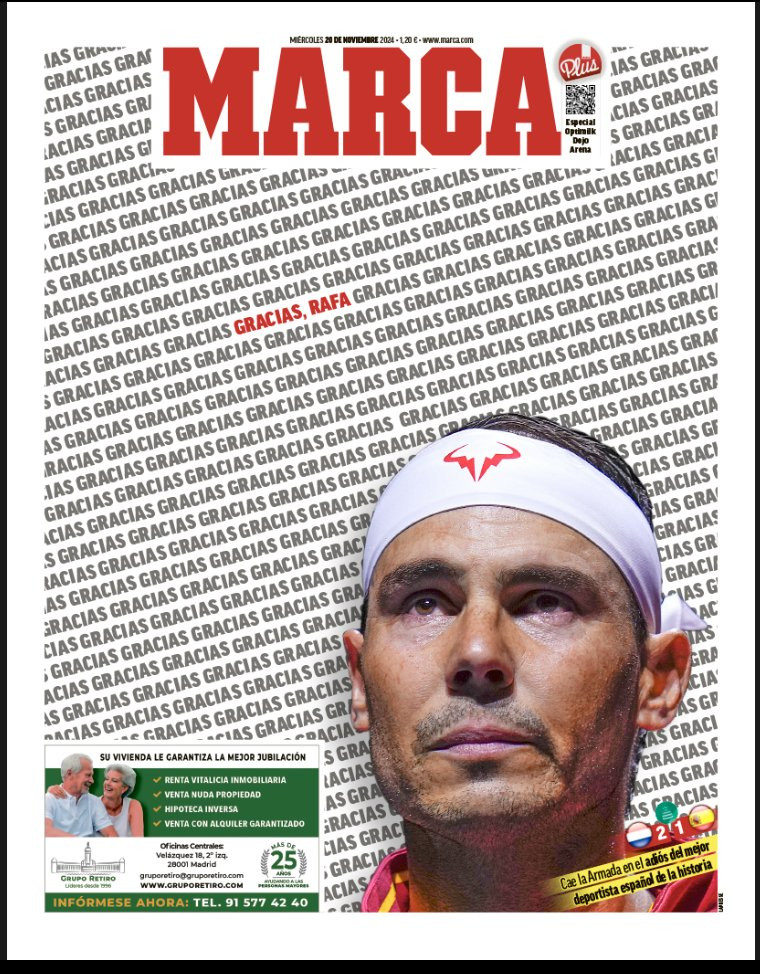 În ziua de miercuri, 20 noiembrie, presa iberică a omagiat cariera excepțională a lui Rafael Nadal, cel mai bun tenismen spaniol din istorie și, indiscutabil, cel mai valoros jucător din istoria tenisului, în ce privește turneele jucate pe zgură.