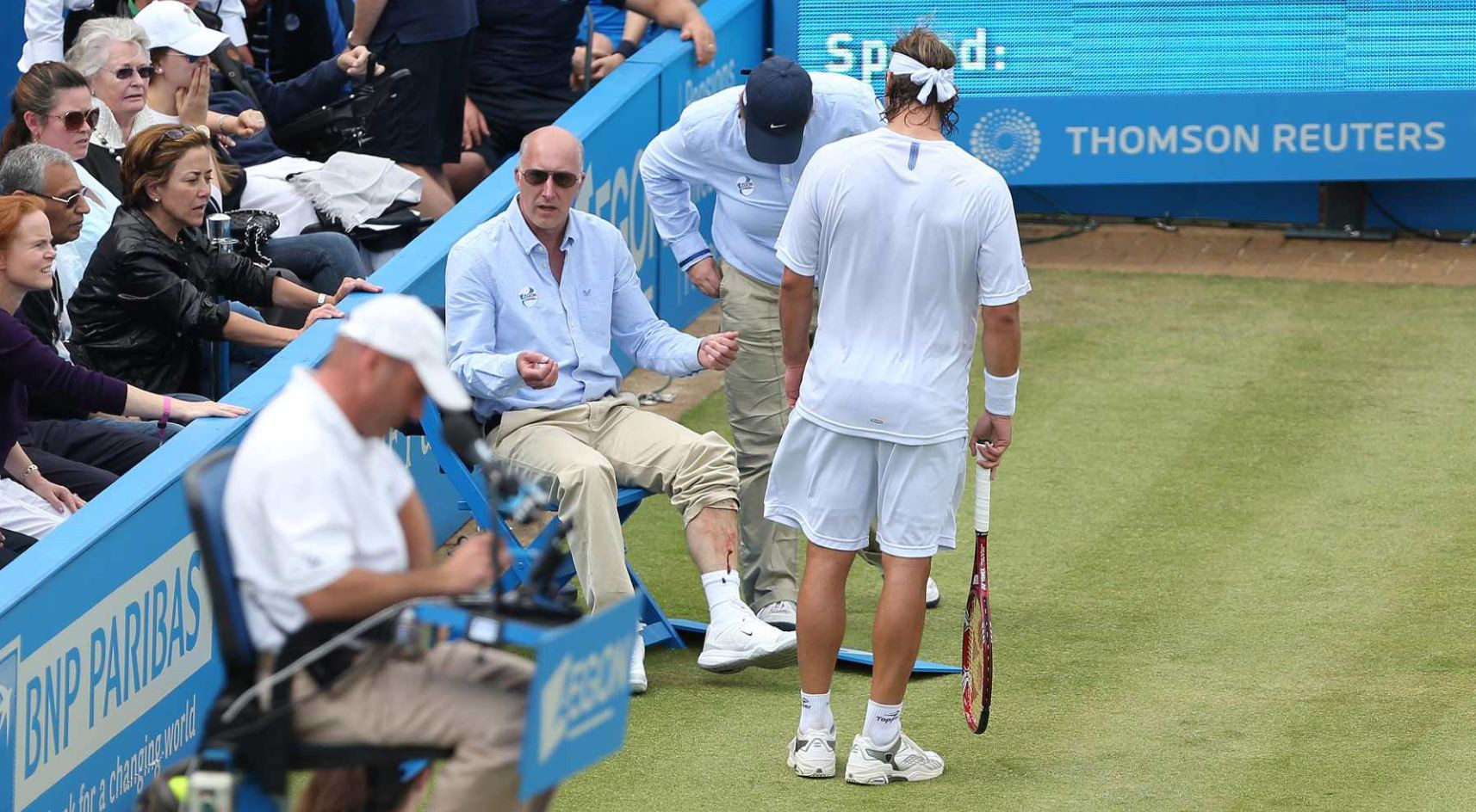 Chiar în finala turneului ATP de la Queen's, argentinianul Nalbandian a lovit cu piciorul o cutie pe care erau imprimate anunțuri publicitare. Prin această lovitură Nalbandian l-a accidentat pe un tușier, care a început să sângereze din picior.