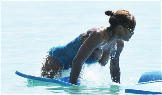 Serena a practicat sportul ei favorit - surful, in afara de tenis bineinteles! Imbracata intr-un costum extrem de sexy, americanca si-a aratat fara voia ei un san. Pentru ca este o fata cu simtul umorului, Serena nu s-a suparat! Din contra, s-a amuzat la maxim de situatie! Bravo ei!