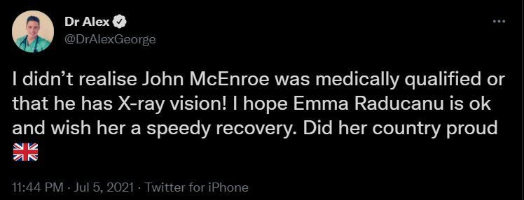 Medicul de urgente Alex George, urmarit de 236,000 de persoane pe Twitter a avut o reactie nervoasa dupa comentariile facute de John McEnroe: "Nu stiam ca John McEnroe e calificat din punct de vedere medical sau ca are vedere cu raze X. Sper ca Emma Raducanu e in regula si ii urez o recuperare rapida. Ai facut tara mandra," a scris Dr. Alex.