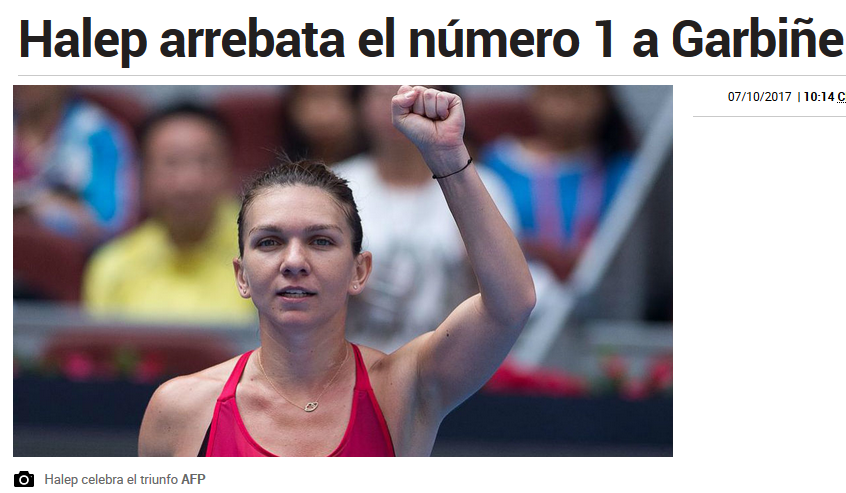 Spaniolii de la AS scriu ca Simona Halep a reusit din a patra incercare sa urce in fruntea ierarhiei WTA si sa ia "coroana" detinuta de patru saptamani de Garbine Muguruza.