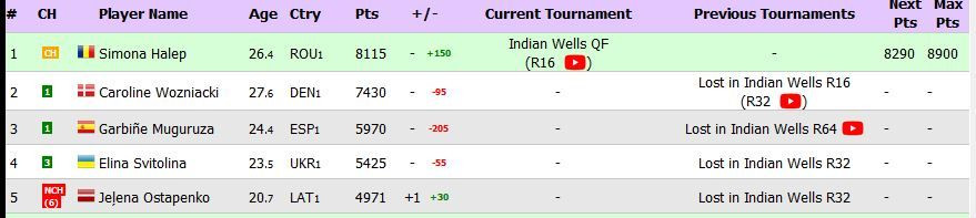 Cum Simona si-a depasit deja punctajul obtinut in 2017 la Indian Wells cand a fost eliminata in optimi, in timp ce Wozniacki va pierde puncte deoarece anul trecut ajungea in sferturi, diferenta in acest moment intre Simona Halep si Caroline Wozniacki este de 685 de puncte si ea se va mari cu cat Simona va avansa la turneu.