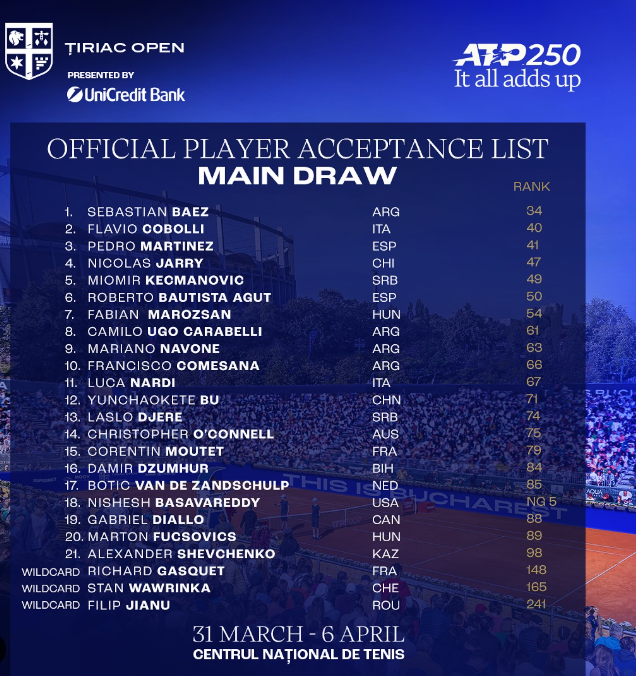 Organizatorii turneului ATP 250 din capitala României au acordat invitații de joc pentru Stan Wawrinka (39 de ani, 168 ATP), Richard Gasquet (38 de ani, 148 ATP) și Filip Jianu (23 de ani, 241 ATP), în ediția din acest an.