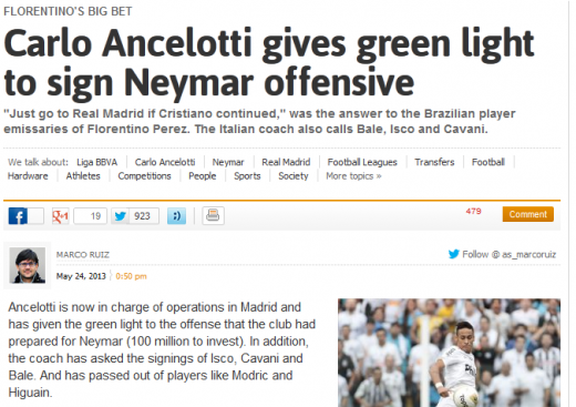 Pe langa acestia, Ancelotti le-a cerut madrilenilor sa il transfere si pe Neymar, brazilianul fiind deja acontat de Barcelona. Pentru a reusi acest lucru, Real va plati 65 de milioane de euro lui Santos si 40 de milioane de euro Barcelonei, ca despagubire, anunta cotidianul As!