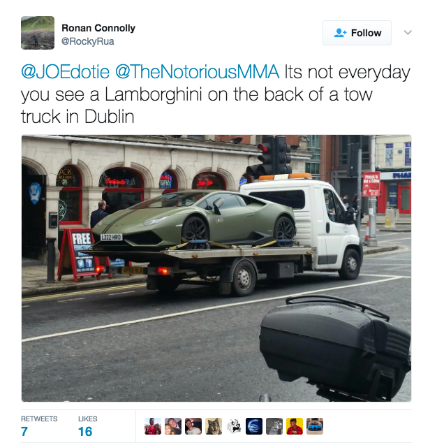 Conor McGregor a aflat de pe net ca masina sa a fost ridicata pentru parcare neregulamentara in Dublin. Vestea vine la doar cateva zile dupa ce luptatorul a prezentat-o fanilor sai de pe Instagram. E doar inceputul unei afaceri prin care luptatorul irlandez spera sa schimbe peisajul auto din tara sa natala. Conor McGregor isi deschide reprezentanta de masini de lux, iar prima adusa este chiar acest Lamborghini Huracan Avio de 200.000 de euro pe care o conduce chiar el. Asta dupa ce o va recupera de la politia irlandeza.