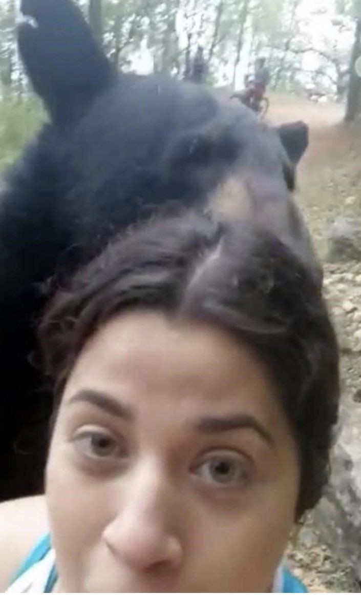One woman managed to take a selfie with the bear as it sniffed her hair