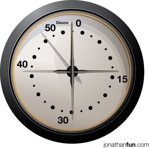 Faptul ca de la 0 se sare la 15, iar apoi la 30, ar putea duce cu gandul la fata unui ceas. Logic ar fi sa urmeze 45. Dar urmeaza 40... o explicatie pentru asta ar putea fi faptul ca dupa 40, trebuie lasat loc pentru inca doua salturi 'pe ceas' - cele doua puncte necesare pentru un set in caz de egalitate. Primul punct ar insemna un '50' transformat in 'avantaj'.